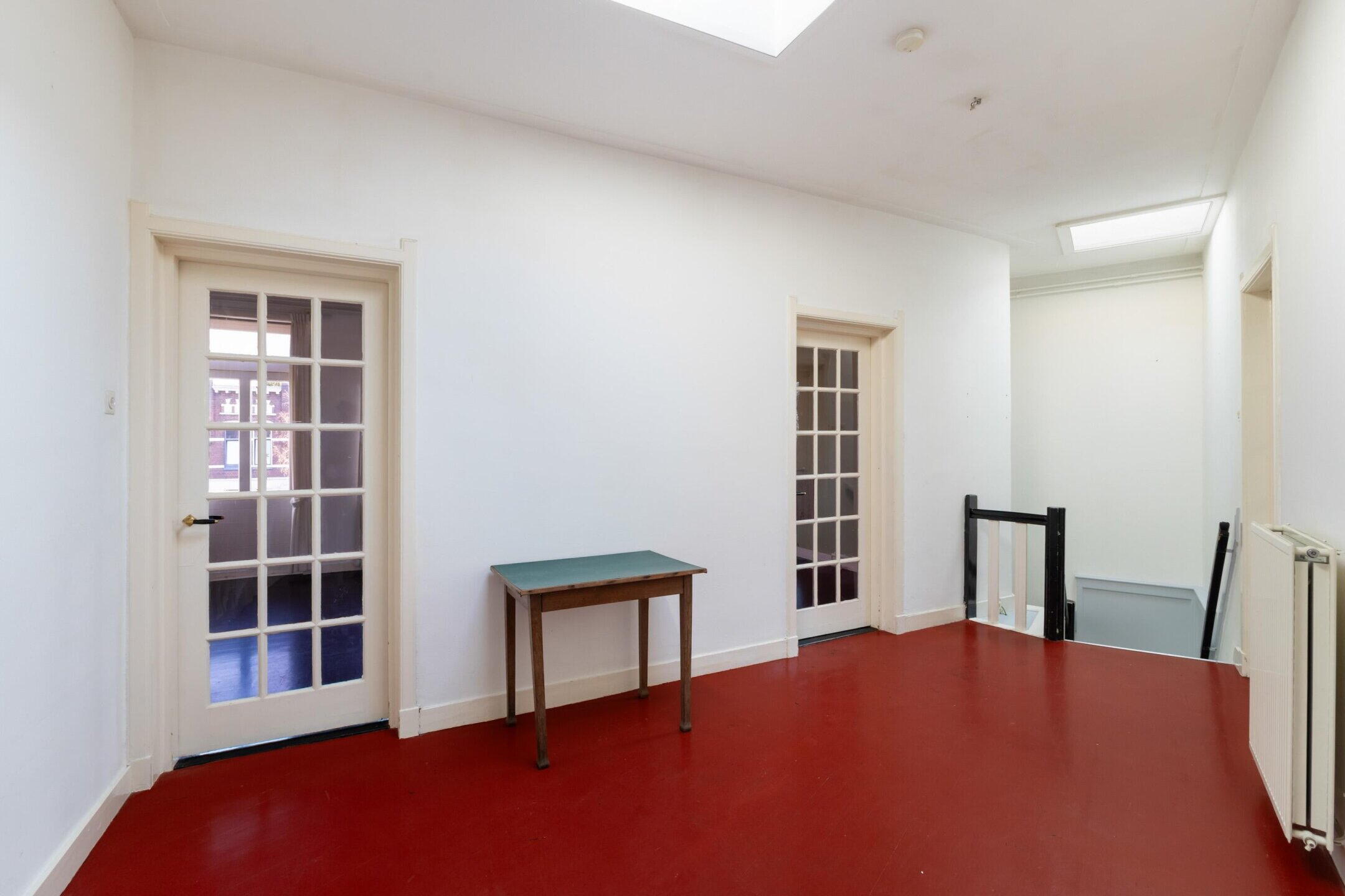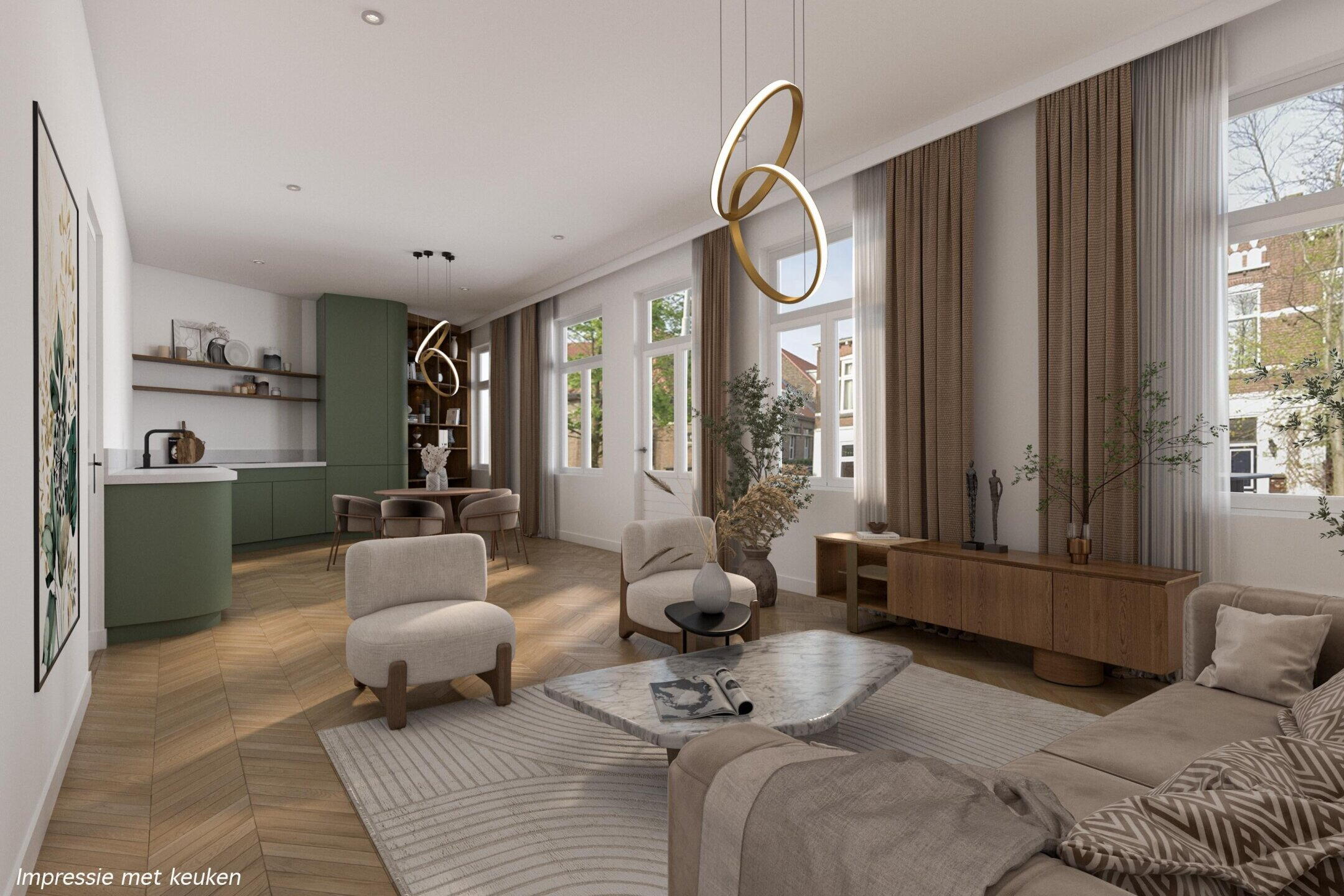 Eenmaal boven valt direct op hoeveel ruimte je hier hebt: circa 113 m². De woonkamer is royaal en licht, een fijne plek waar je alle kanten mee op kunt. De keuken zit nu nog apart, maar er is al nagedacht over alternatieven. Zo laten een van de impressies zien hoe je de keuken naar de woonkamer kunt verplaatsen, waardoor je eenvoudig een extra (derde) slaapkamer creëert. Liever de huidige indeling? Dan laat de andere impressie zien hoe je de woonkamer optimaal kunt benutten zoals het nu is.
