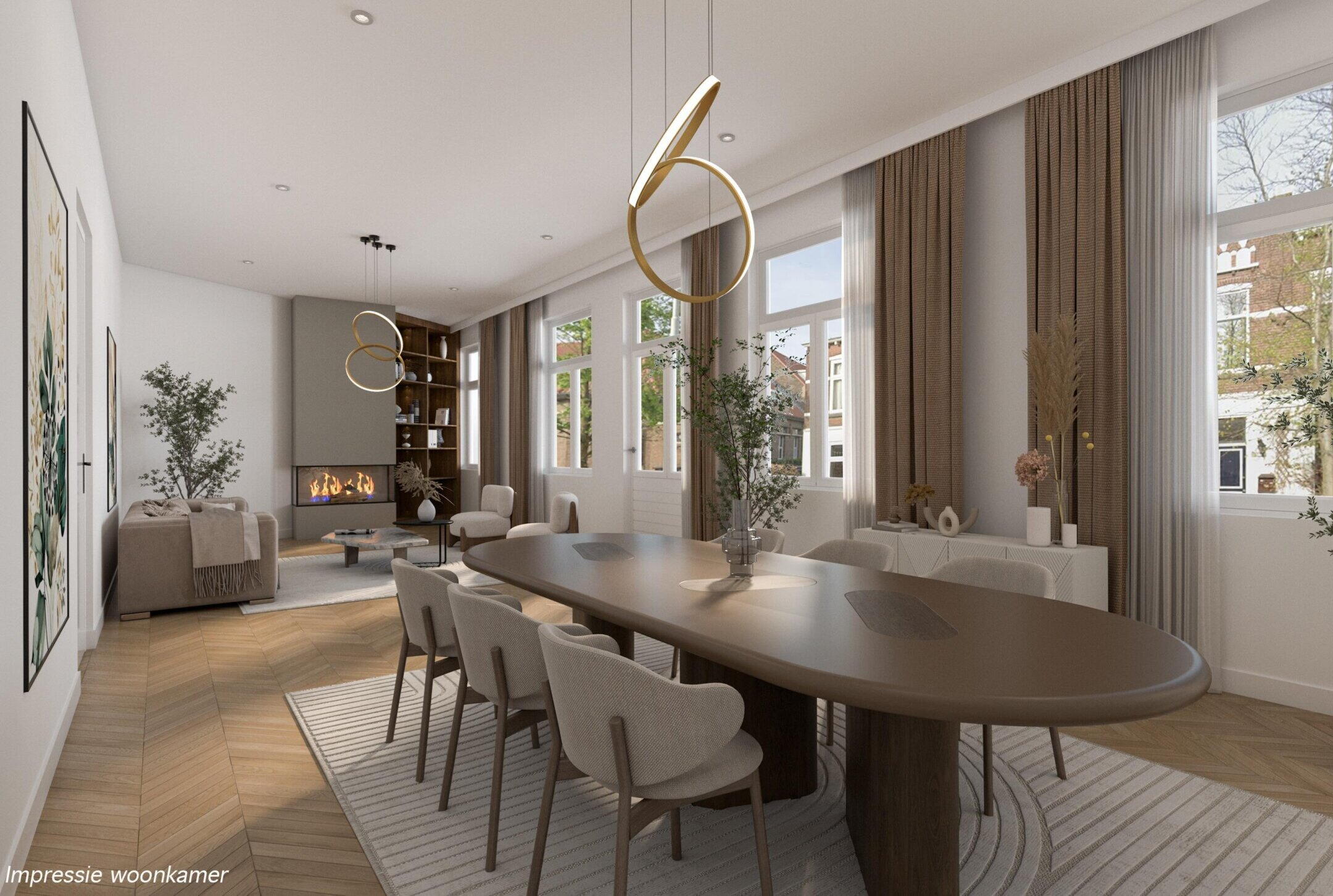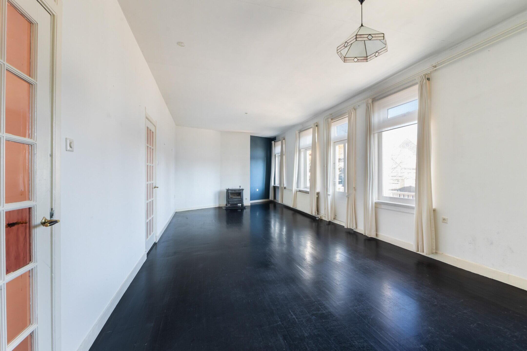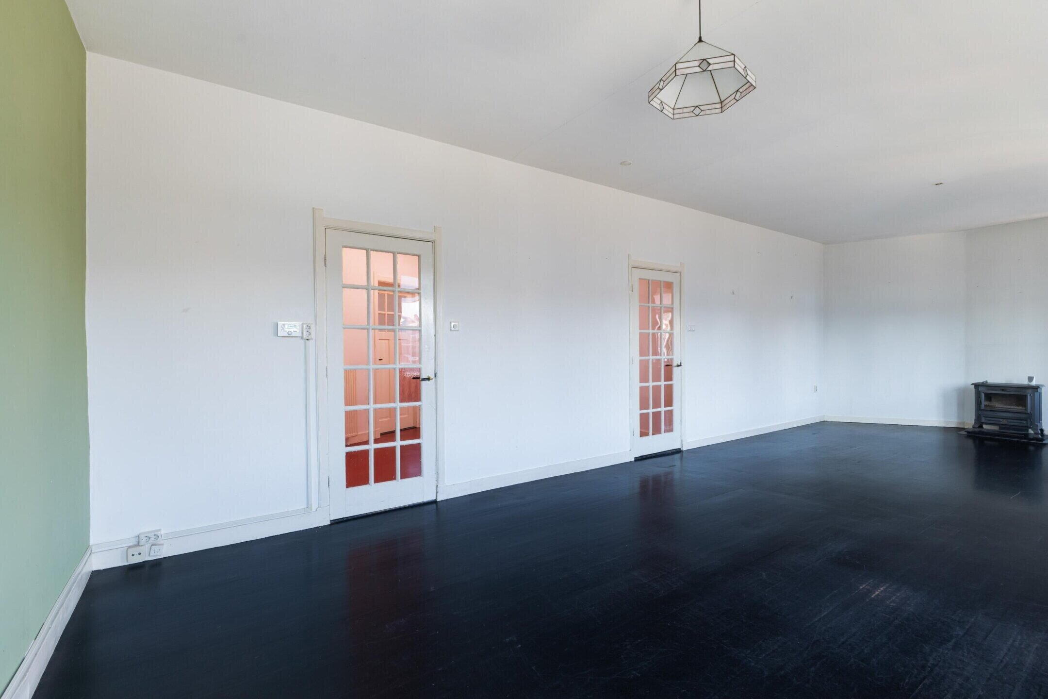 Grote, lichte woonkamer, hoge plafonds